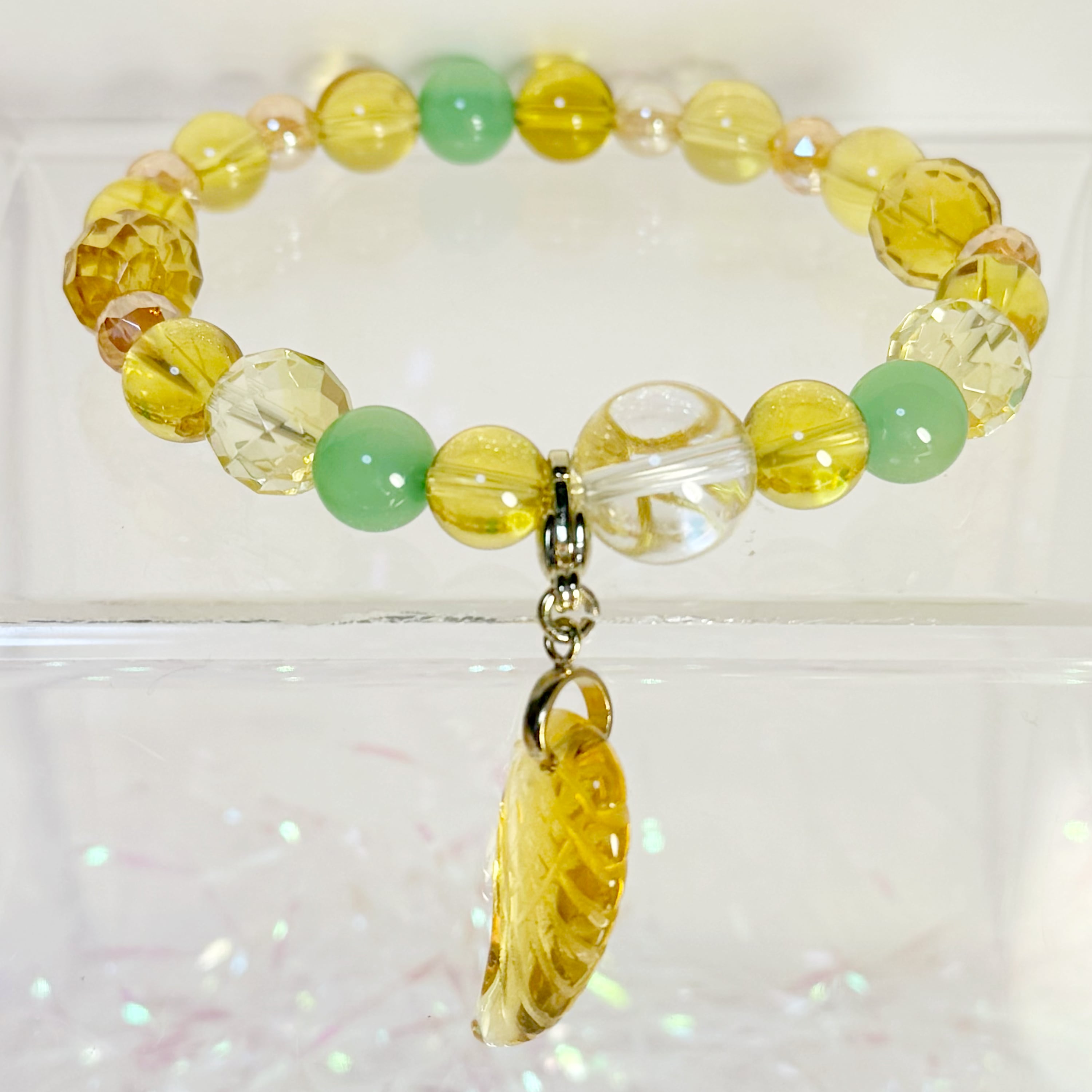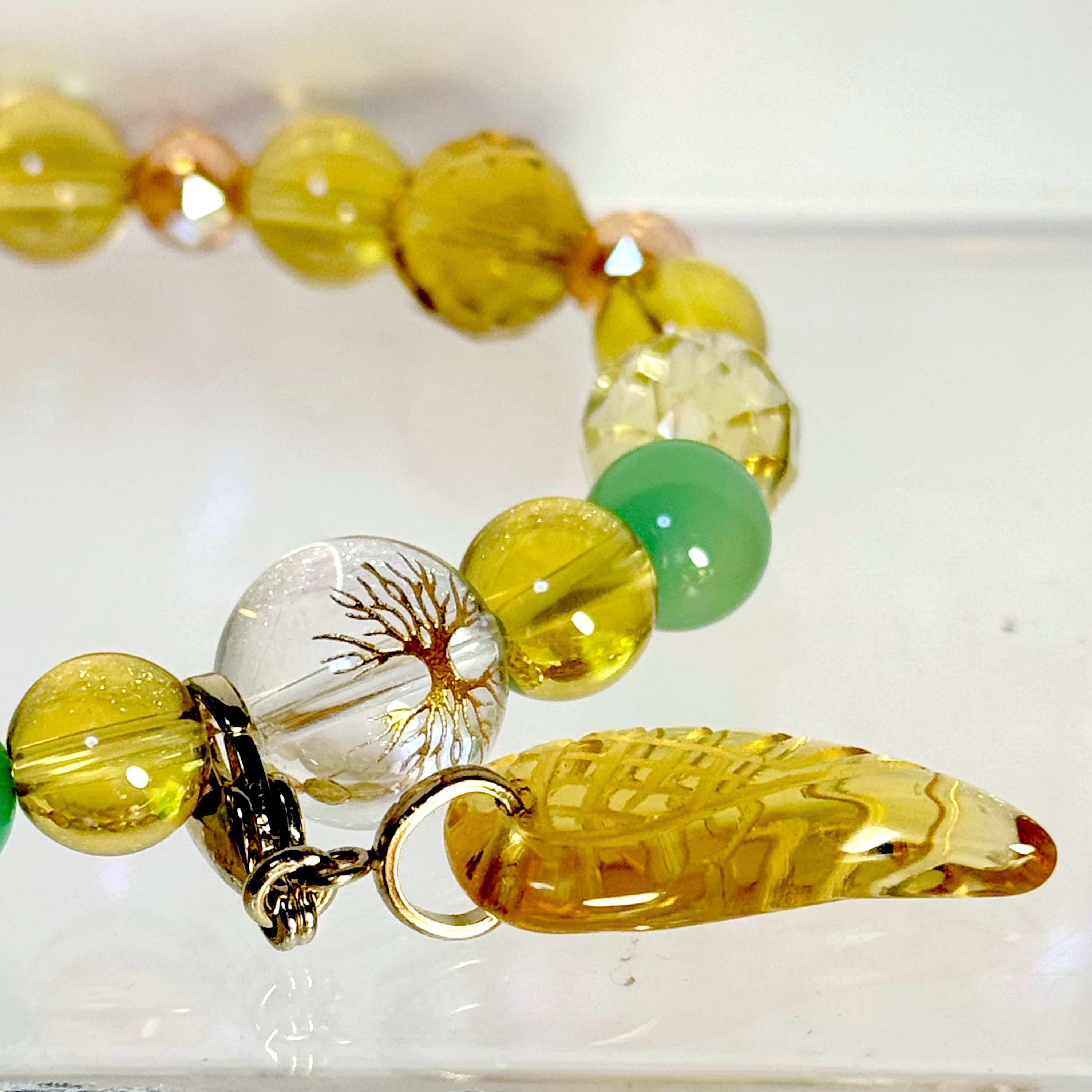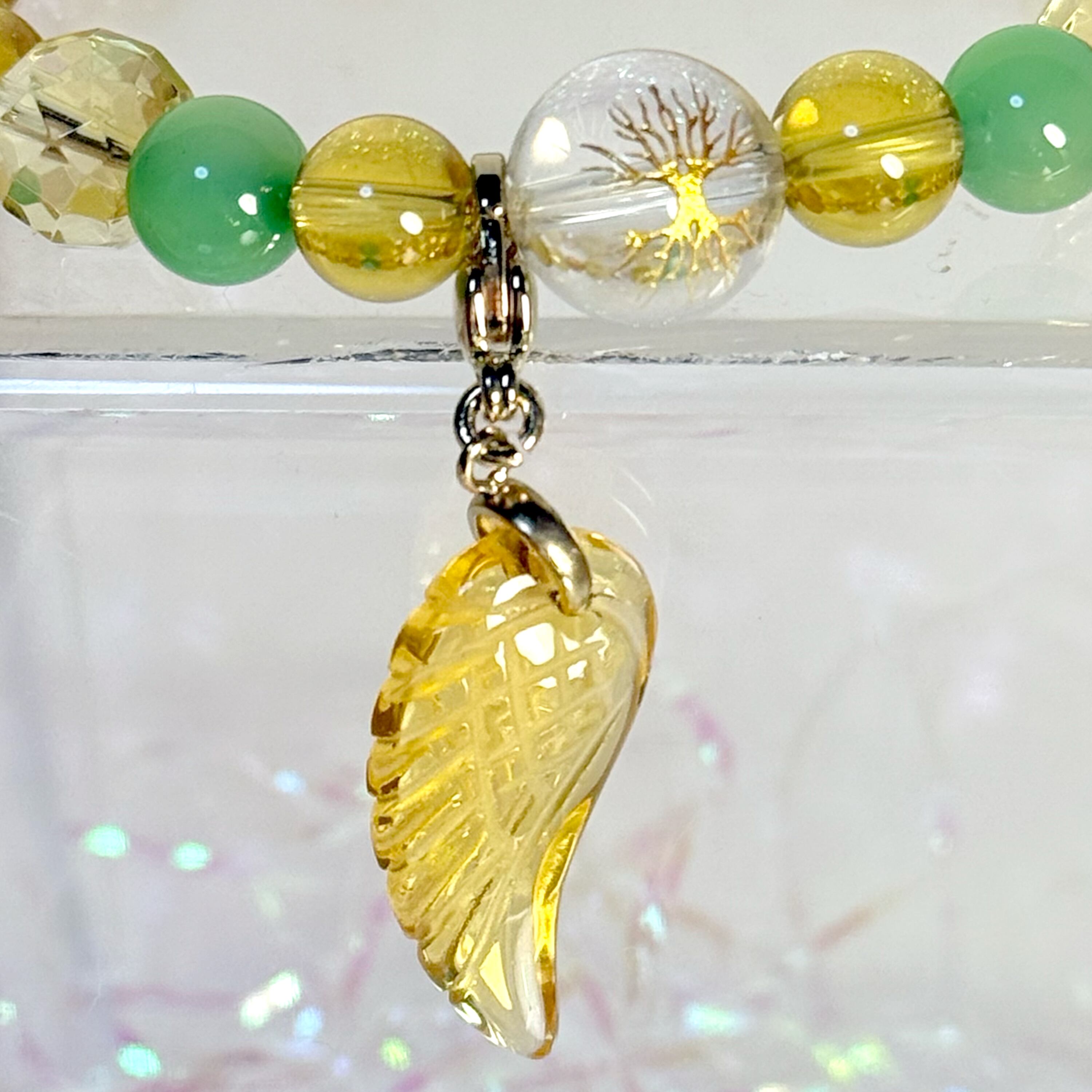 神秘的で魅力的な「クレオパトラ」は、シトリン64面カット、シトリン、エメラルドグリーンメノウ、ゴールデンオーラ64面カット、Lucaゴールド、シトリン羽を使用した特別なアイテムです。シトリンは自信と繁栄をもたらし、エメラルドグリーンメノウは心に安らぎを与え、ゴールデンオーラの輝きが持つ人にポジティブなエネルギーを注ぎます。シトリン羽がもたらす軽やかさは、見る人を魅了し、取り入れることで一層の美しさを引き立てます。