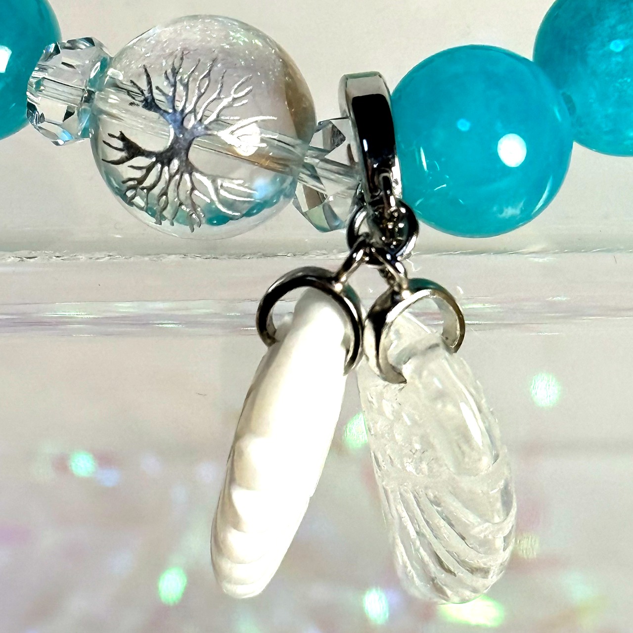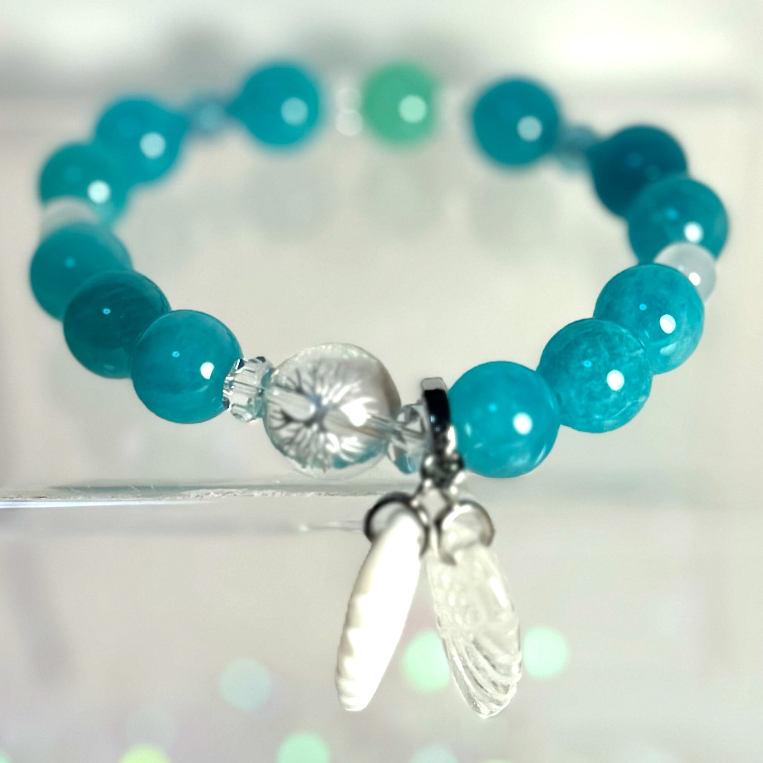 「キセキ」は、アマゾナイトシリカやエメラルドグリーンメノウをあしらい、独自の魅力を持つ特別なアイテムです。このブレスレットは、ミルキークォーツやアクアオーラ64面カット、ボタンカット水晶を使用し、さらにLucaシルバーや水晶羽、ホワイトシェル羽を組み込むことで、あらゆる場面で目を引くデザインが生まれました。アマゾナイトシリカの持つリラックス効果やエメラルドグリーンメノウの心身を整える力は、持つ人に新たなインスピレーションと安らぎをもたらします。